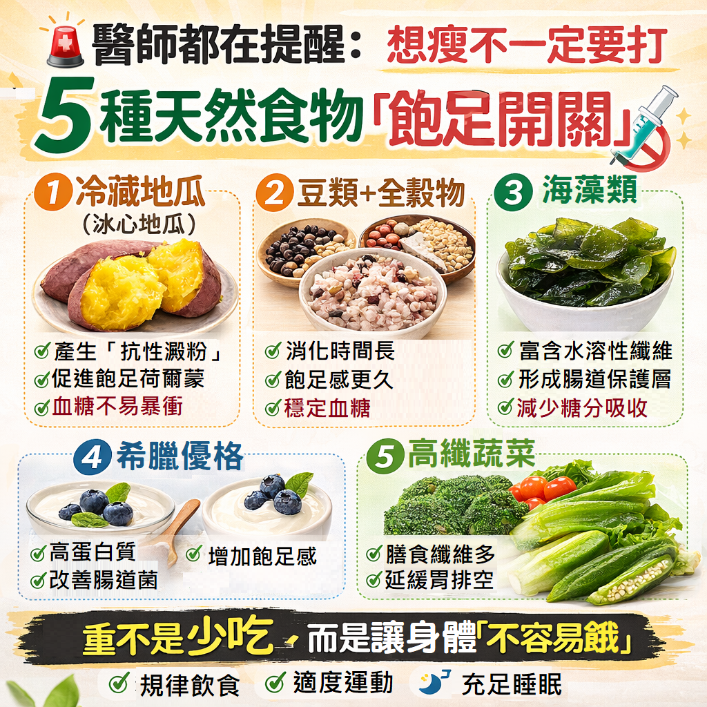 近年來,俗稱「瘦瘦針」的腸道荷爾蒙藥物成為減重市場的新寵,但如果不希望仰賴藥物輔助,也有其他更天然的選擇。營養師指出,透過日常飲食中的5種「天然瘦瘦針」食材,同樣能達到穩定血糖、增加飽足感的效果。